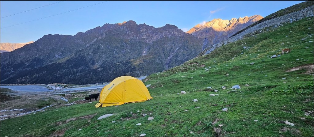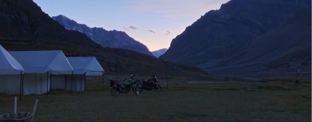 This outdoor camping experience, and especially the toilet arrangement was a new experience for me. For the toilet, the staff dug up a 2 foot deep hole in the ground, and put up a tent around it. You do your job in that hole, squatting on the ground, leave your toilet paper in the hole and cover up your job with a layer of some loose mud for the sanity of the next person. Once the campsite is done with, the staff fill up the hole and leave it to naturally decompose. Overall very workable, though squatting on the ground after a 5 hour riding day is not very forgiving on the knees. I wished they had a portable toilet seat. There was a separate tent for dining, and another one for their kitchen. Overall, a good setup. For the B’s, who normally do their own camp and cooking setup during their bike packing expeditions, this was luxury. As for me, I didn’t really sleep too well. Around 11 PM, a bunch of locals arrived on the scene and had a raucous conference about a pipe that ruptured near our camp that seemed to have cut off water supply to their accommodations. Being a light sleeper, the continuous sound from that water was already disturbance. Added to that, my tent was on a bit of a slope causing me and my sleeping bag to slide down inside the tent incessantly, and then this was the first night above 3000m and acclimatization was yet to set in. But this is what I had signed up for and didn’t complain. The morning sight of the sunrise over the mountains and that of the vultures more than made up for any discomfort. Needless to say, there was no power for recharging nor any bathing facilities at this site. My Airtel network didn’t work at the camp though it worked just a bit further away. Jio seemed to be operational.