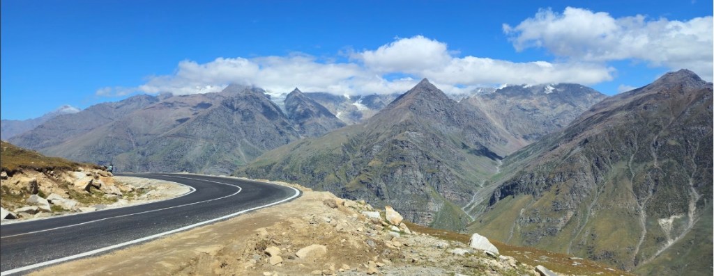 Anyway, back to D2. We were headed to Rohtang Pass and from there, onto Sissu. Marhi was just a pause on the climb that continued all the way for another 16KM / 3 hrs up to Rohtang Pass with similar valley and mountain views as the previous day. The Pass was a crowded tourist location. Tea shop tents were abuzz with activity and tourists were all over the place. The views of the snowcapped peaks around the Pass were stunning. After a short break for a cup of coffee, pictures and to recoup energy, we continued our ride. What I didn’t expect was that the views on this side were even more amazing. The next 20KM was a long steep winding downhill with excellent roads, and I wasn’t prepared for that. I was freezing. I first pulled on a light wind jacket. Then some full finger gloves. And finally a buff to cover my neck and ears. With all that, my extremities – fingers, toes and nose – were still going numb. The B’s were a lot more acclimatized to these temperatures. Near the end of the descent we stopped for a pre-packed lunch of potato chapati rolls that were also desperately cold. A couple of cups of hot Ginger Lemon Tea helped get the blood circulating again. After another 15KM of riding, where we rode past the other end of the Atal Tunnel and rode alongside the Chandra River, we reached Sissu which seemed a well inhabited small town. Here, we were put up in a so called homestay, which in reality was a small hotel. So we had our own rooms, with electricity, hot water geyser, a proper bed and a working cellphone network… pure luxury.