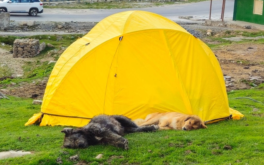 Marhi is just an open space in the mountain with a couple of coffee shops, a stream, some wandering shepherds with their cattle and dogs, and then of course a bunch of vultures. I learnt later that Marhi also hosted the Paragliding World Cup just a month later. We set up camp in the middle of a space that had cow dung everywhere you looked. This was my first experience with outdoor camping. A couple of friendly shepherd dogs settled in the shade behind my tent. I had the tent to myself since we were an odd number of trekkers, which was good because I needed that space to handle my 120L duffel bag! The B’s shared a tent, and being experienced trekkers, each had something like a 40L backpack, the contents of which had already been through a month of European holiday! I never learnt to pack light. Amazing what experience can teach you. We woke up to a beautiful sunrise view, and to the spectacle of not less that 20 Himalayan Vultures perched on the flats near my tent.